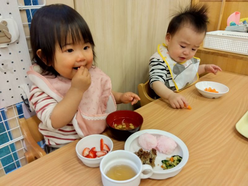ひな祭り行事給食。もうすぐ1歳児さん、手を使ってじょうずに食べています。