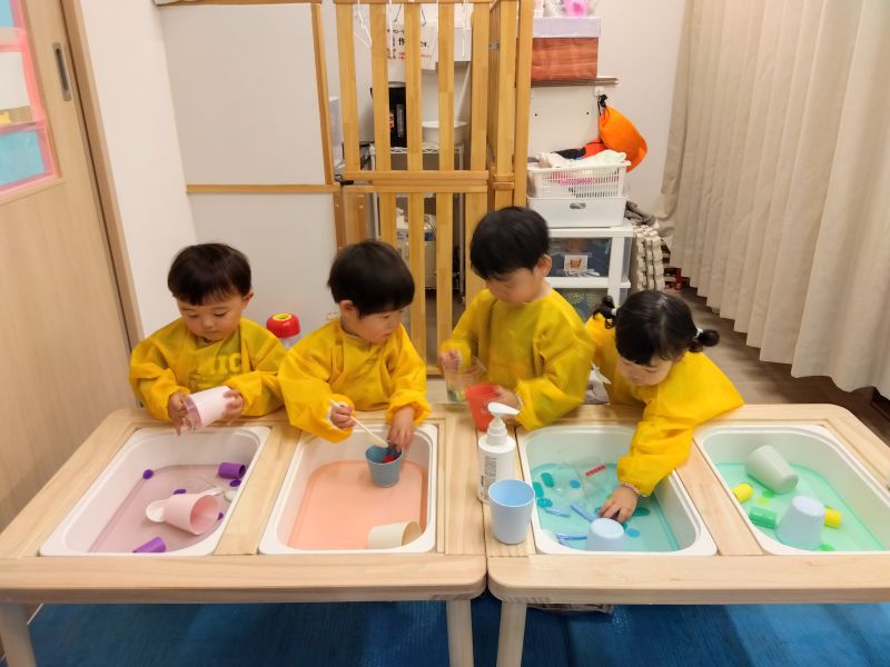 色水遊び。夢中になって遊ぶ1歳児さんです。